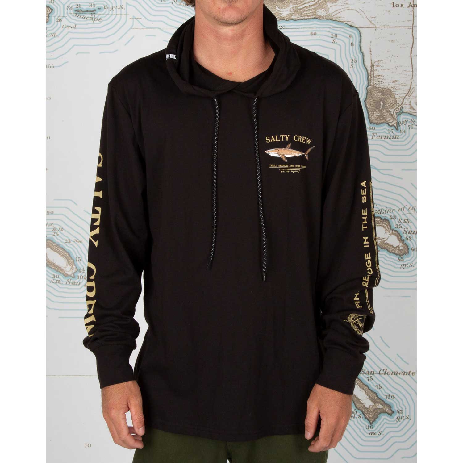 The Bruce Hood L/S Tech Tee in Black is a long sleeve technical hood tee featuring UPF 40, premium long sleev...