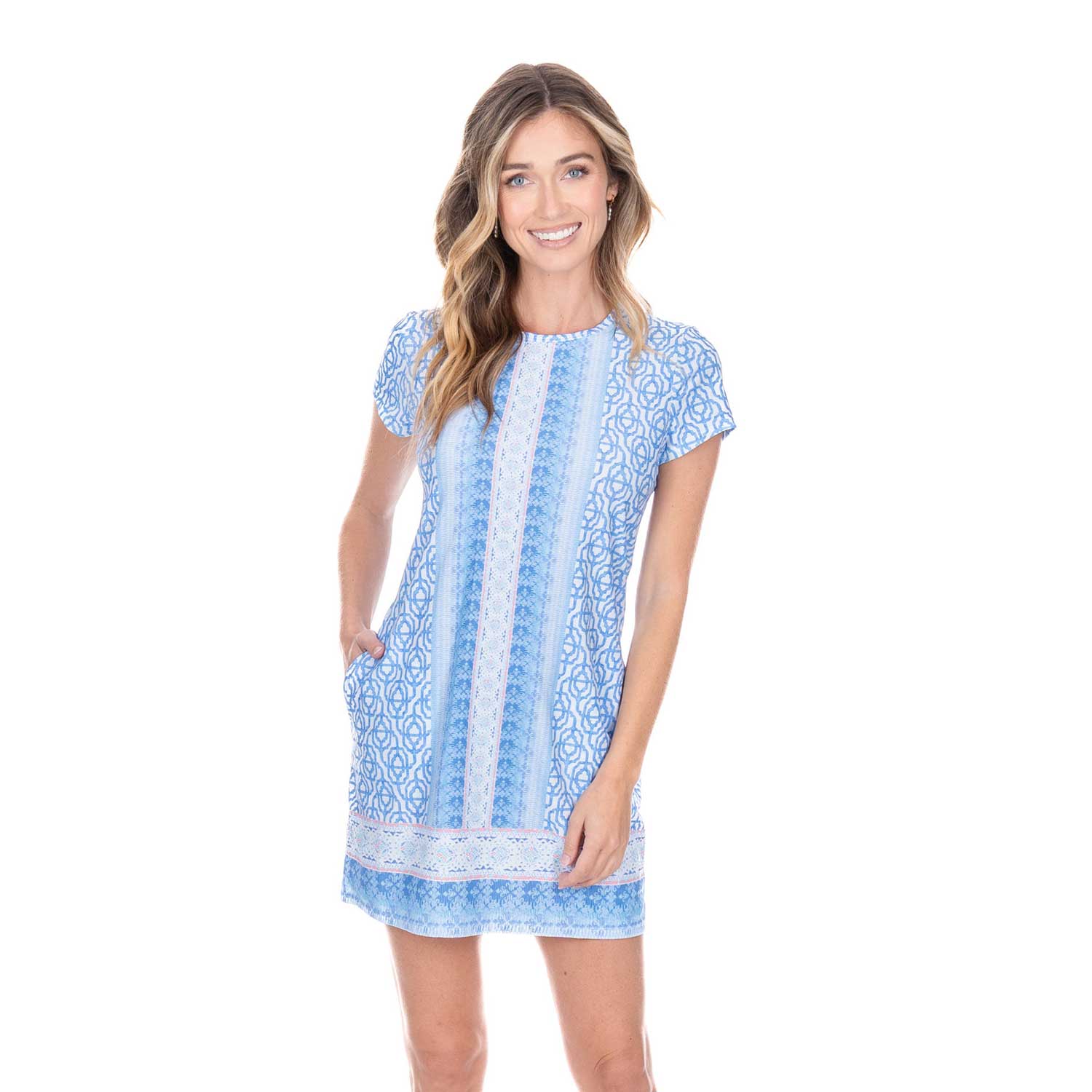 The Lake Como Short Sleeve Shift Dress is a classic style that can be dressed up or down. This style features our pastel Lake Como print, a rela...