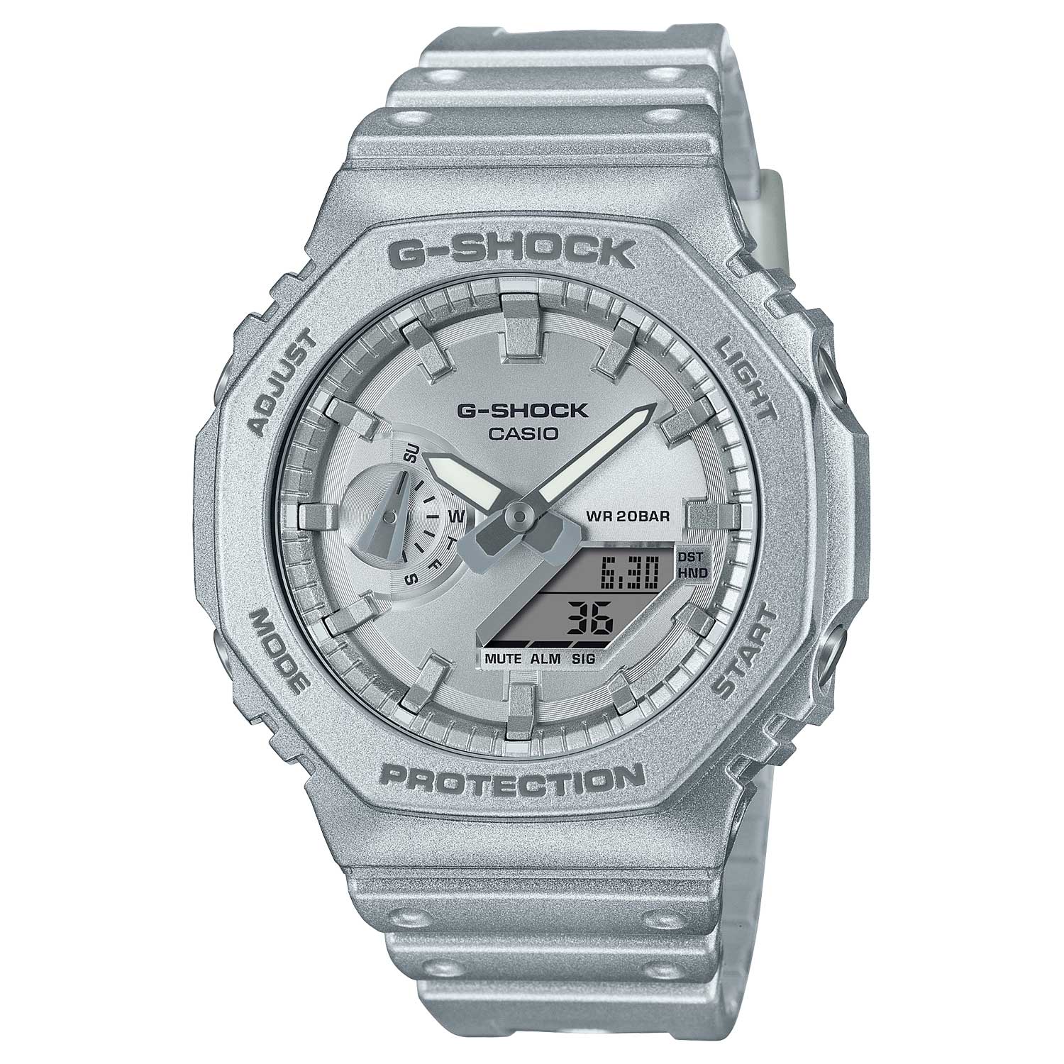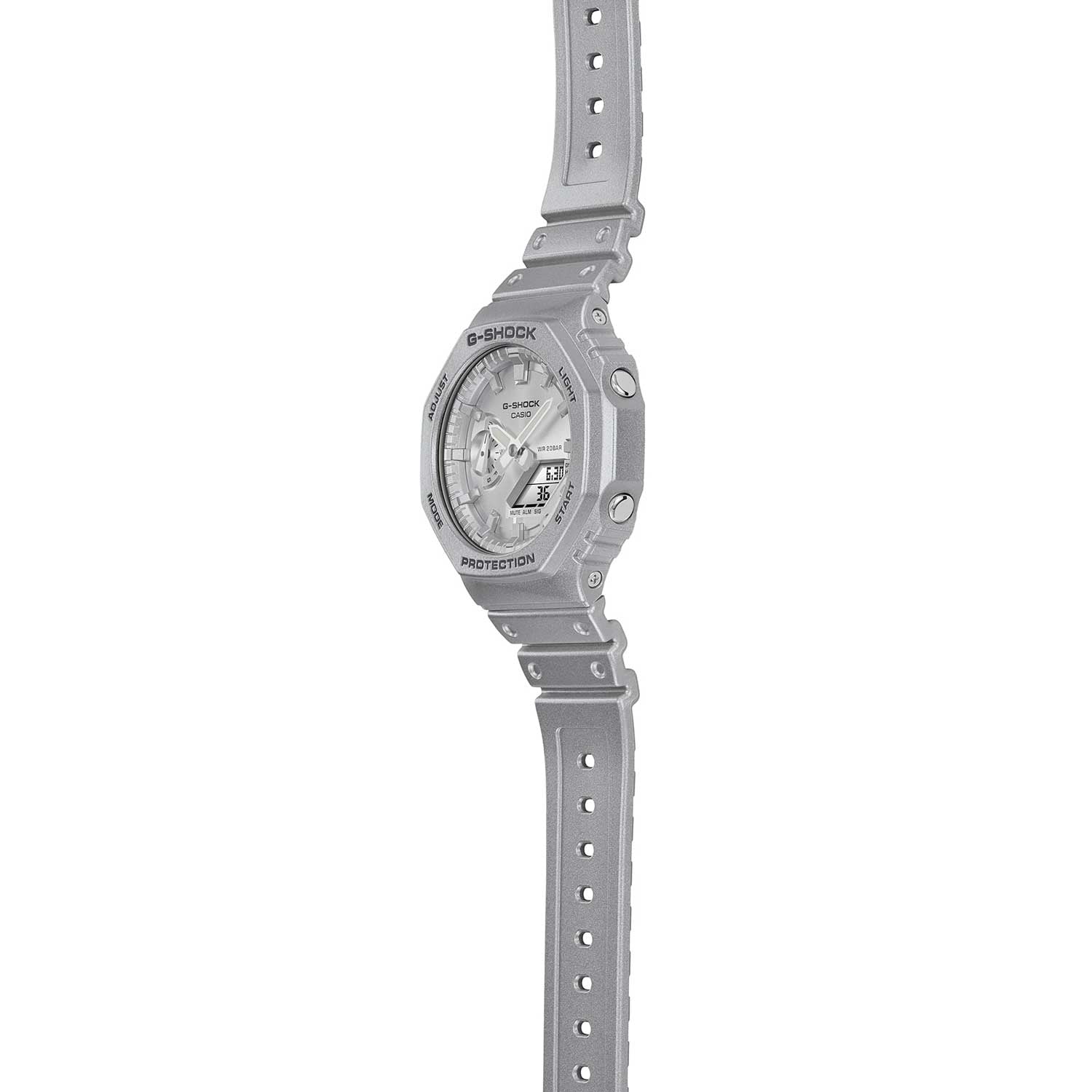 Garbed in a full-body metallic silver paint, the GA-2100FF-8A exemplifies G-SHOCK's commitment to innovation and design. A circular hairline finish on the dial contrasts beautifully with the shimmering case and bezel, giving the watch a distinct and captivating look.