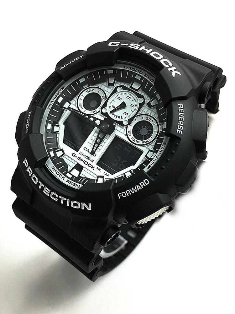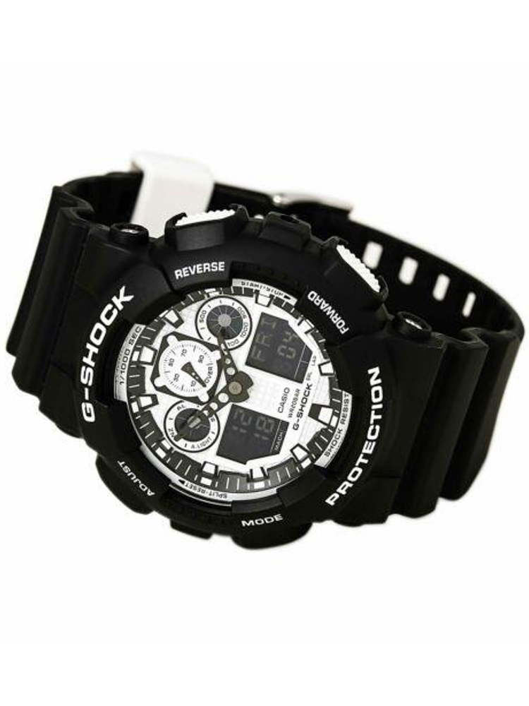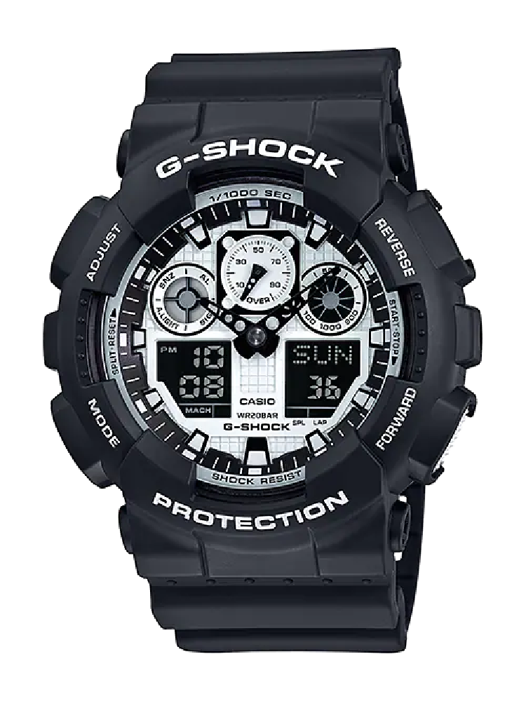Casio's GA-100 in monochrome—the original oversized analog-digital hybrid that kicked off the "big watch" trend before every brand copied it. Black case, white accents, zero compromise on features. It's the G-Shock that looks deliberate, not tactical. The one you can actually wear with black jeans and a leather jacket without looking like you're about to storm a building.