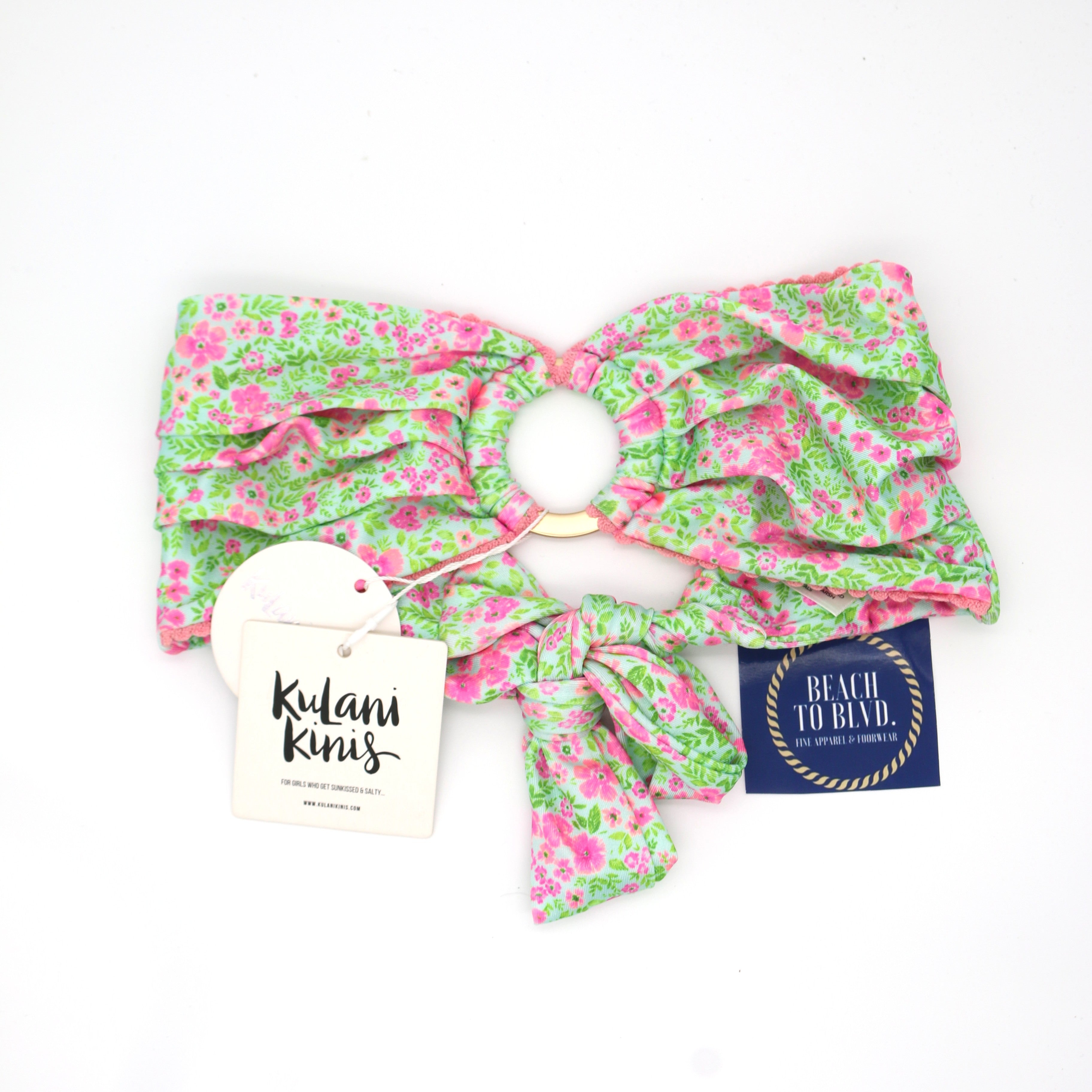 Forbidden love green and pink ditsy floral print strapless bandeau top with ring detail. This is a perfect tanning top style made to ensur...