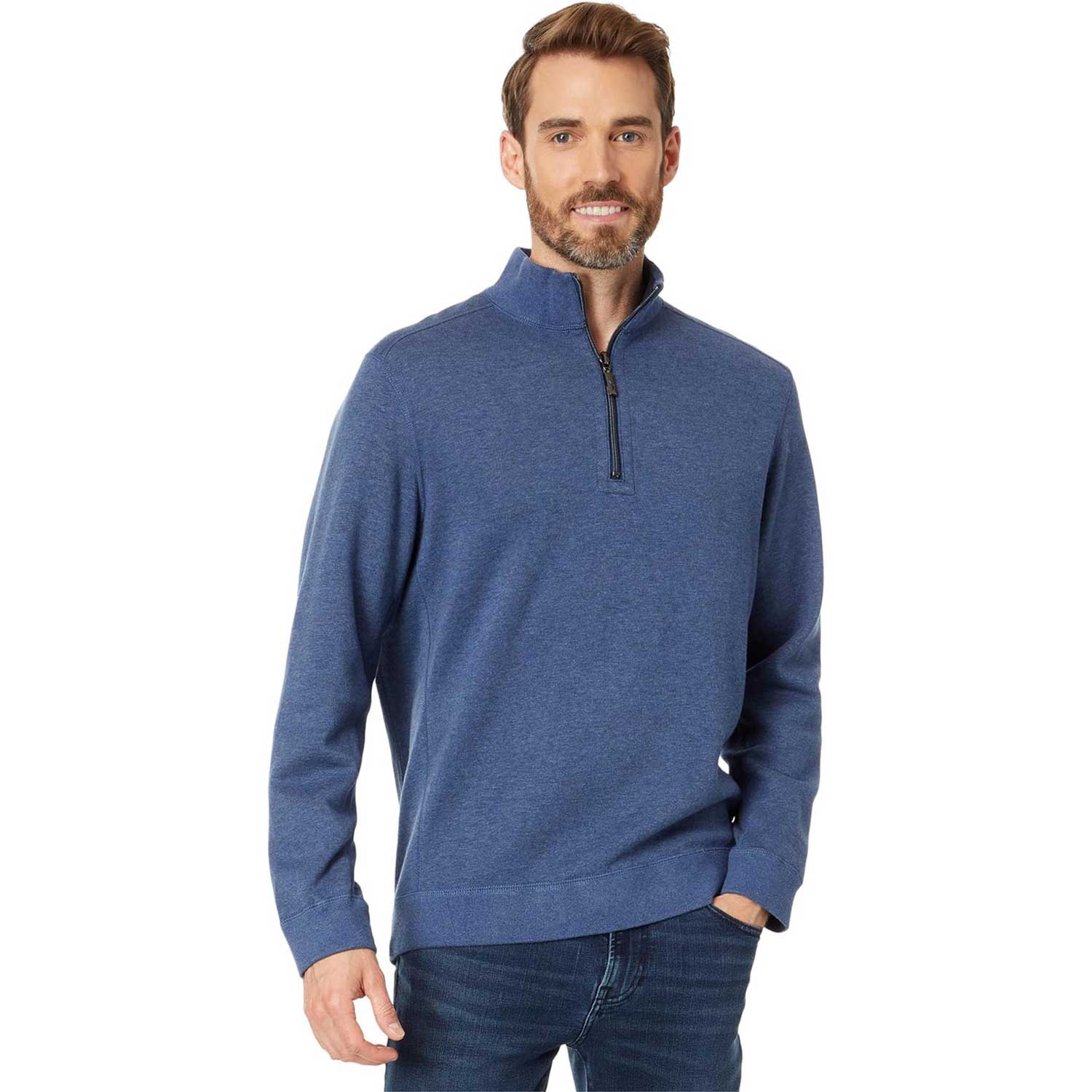 This cotton-blend pullover features a half-zip placket for easy on and off and a reversible design for two looks in one.