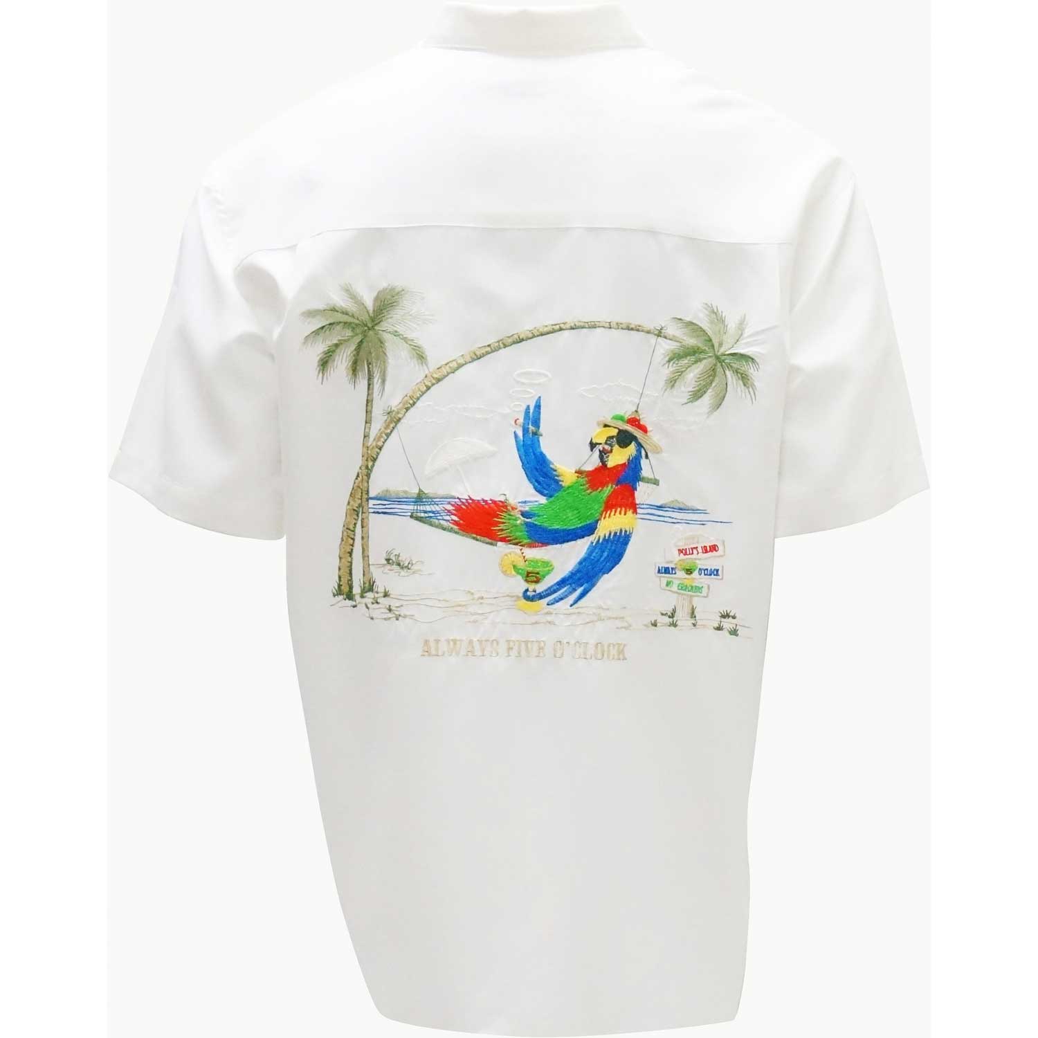 One of our best seller's and most favored weekend edition shirt to buy, Always 5 O'Clock is a short sleeve back embroidered camp shirt featuring a parrot enjoying his time in Bamboo Cay's paradise island. He is relaxing and having a drink all with Bamboo Cay's classy elements around him making this is a must have for any Bamboo Cay collector. In addition, there is a front pocket embroidery of the same parrot. Finished with a pointed collar, full-length front button closure and a split hem, embossed on a soft textured imported modal fabric, this Bamboo Cay shirt will get you noticed without drawing attention to yourself.
