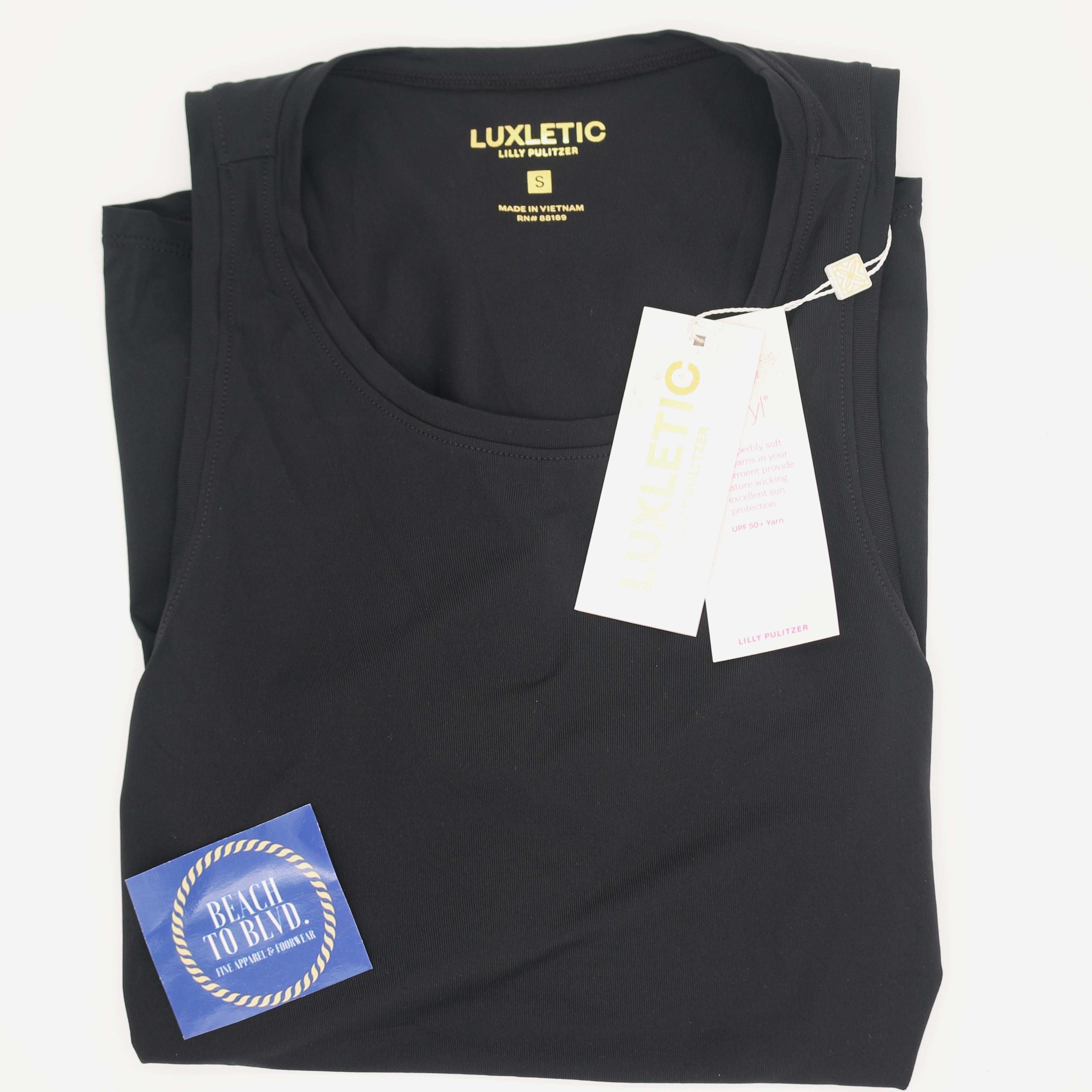 - UPF 50+ Luxletic high neck tank with shirt tail hem. Moisture wicking.